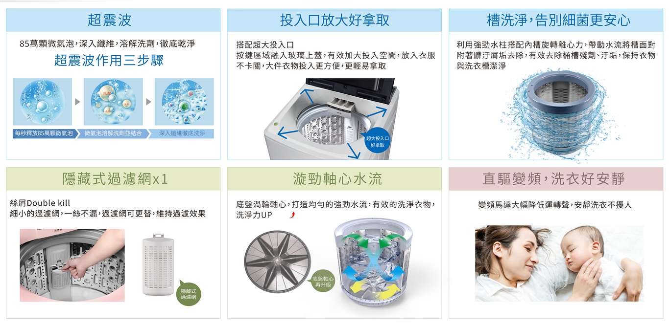 超震波洗淨+漩勁軸心水流,抗菌不鏽鋼內槽,洗衣更潔淨