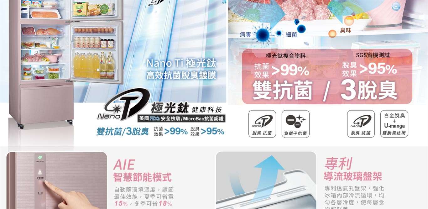 Nano-Ti 極光鈦+白金/U-manga 雙脫臭功能,負離子抗菌守護食材衛生 VIP真空斷熱材+AIE智慧節能模式+R600a環保冷媒,節能又環保