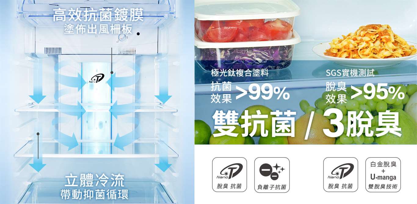 變頻一級能效 + AIE智慧節能模式,省電又環保 Nano Ti 極光鈦高效抗菌鍍膜,搭配白金、U-manga、三脫臭功能,食物更衛生 全新循環冷流柵板,冷藏冷凍更均勻 一級能效、節能標章、環保標章,信譽品牌安心選擇 ✅