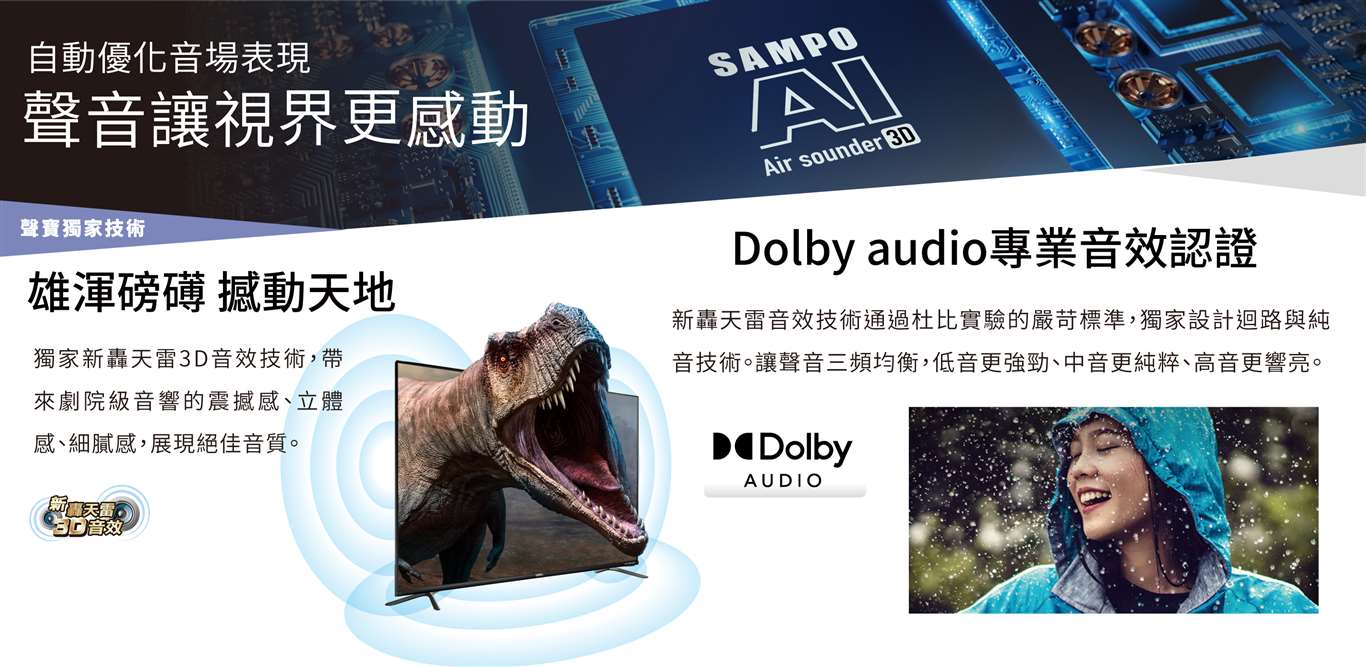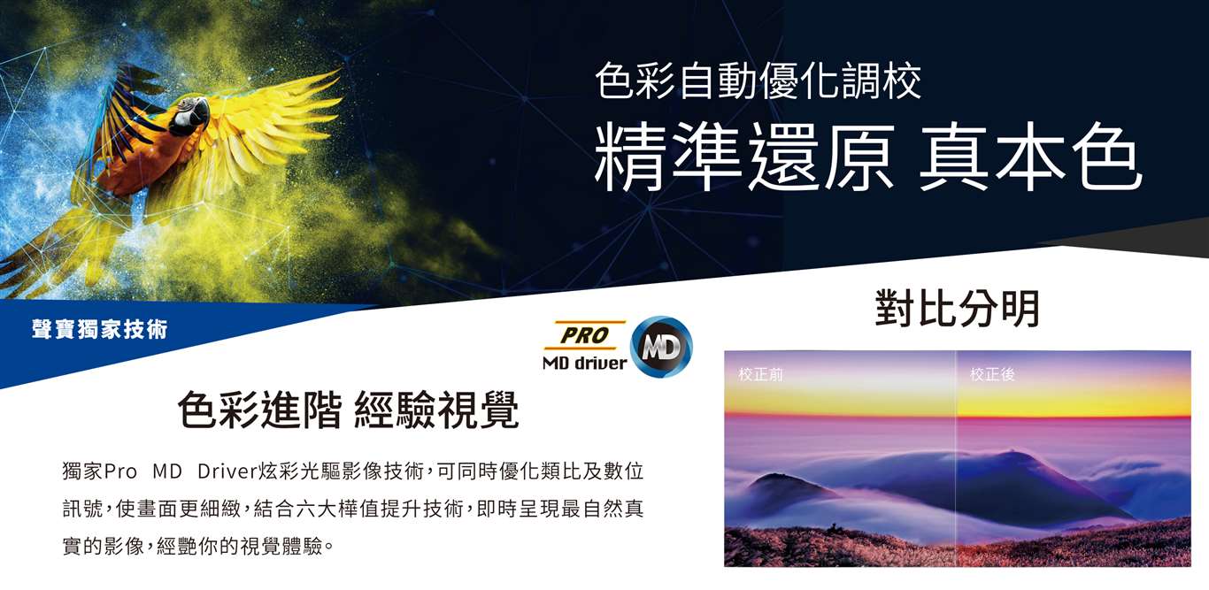 搭載 Pro MD Driver 炫彩光驅影像技術,畫質細膩明亮 內建音箱式喇叭單體與新轟天雷3D音效技術,結合 Dolby AUDIO 杜比音效解碼,呈現震撼立體音場