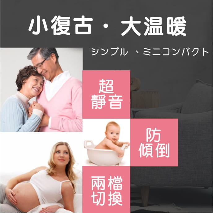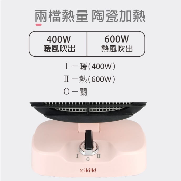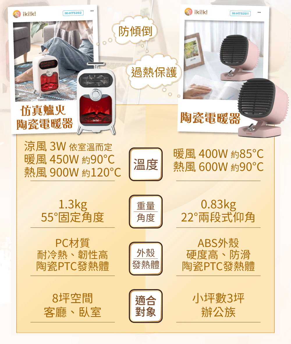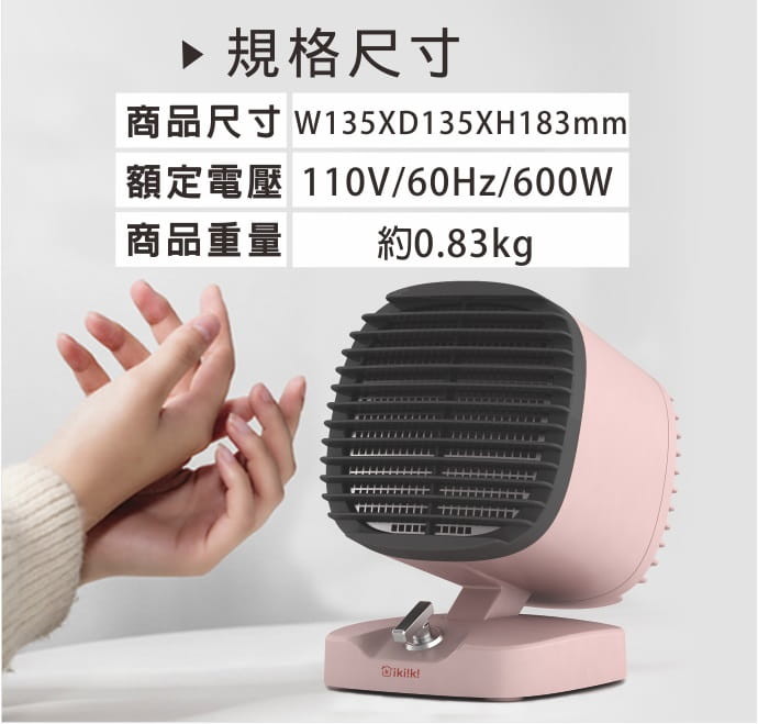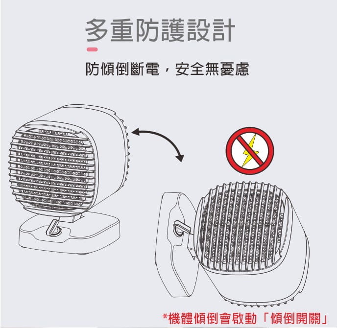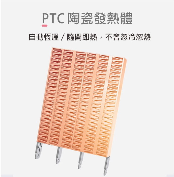 PTC陶瓷發熱體,開機即熱 兩段溫控自由調節,出風口可向上調整 多重安全防護設計:防傾倒斷電、外殼防火ABS材質,安全又貼心